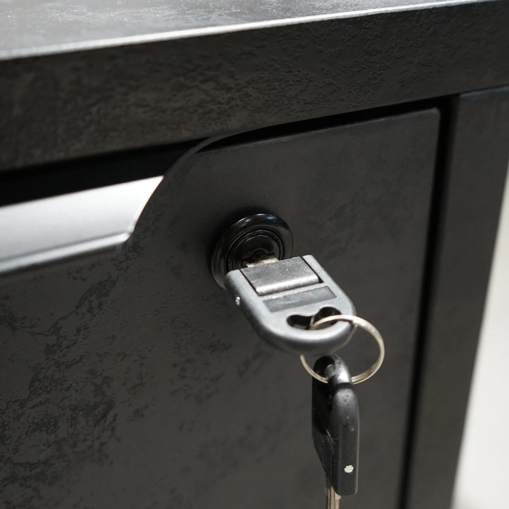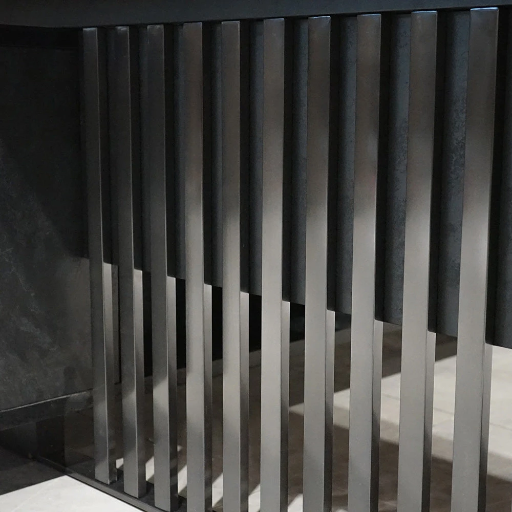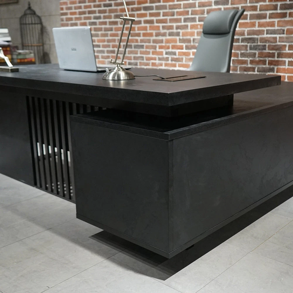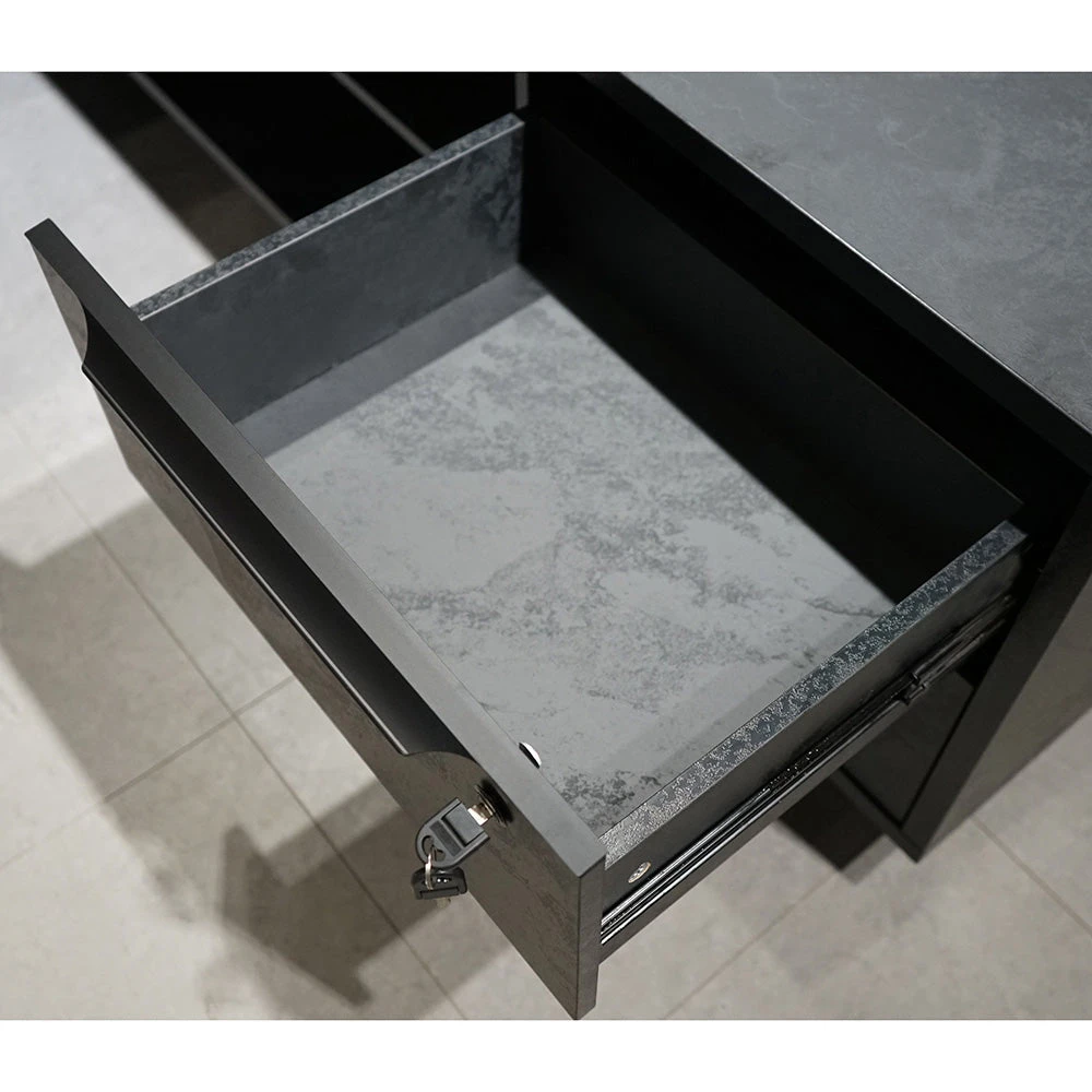 The 2m DAXTON Executive Desk combines sleek black concrete melamine with a premium German Hueck textured surface finish, enhanced by matte black stainless steel bars for a contemporary and sophisticated aesthetic.
