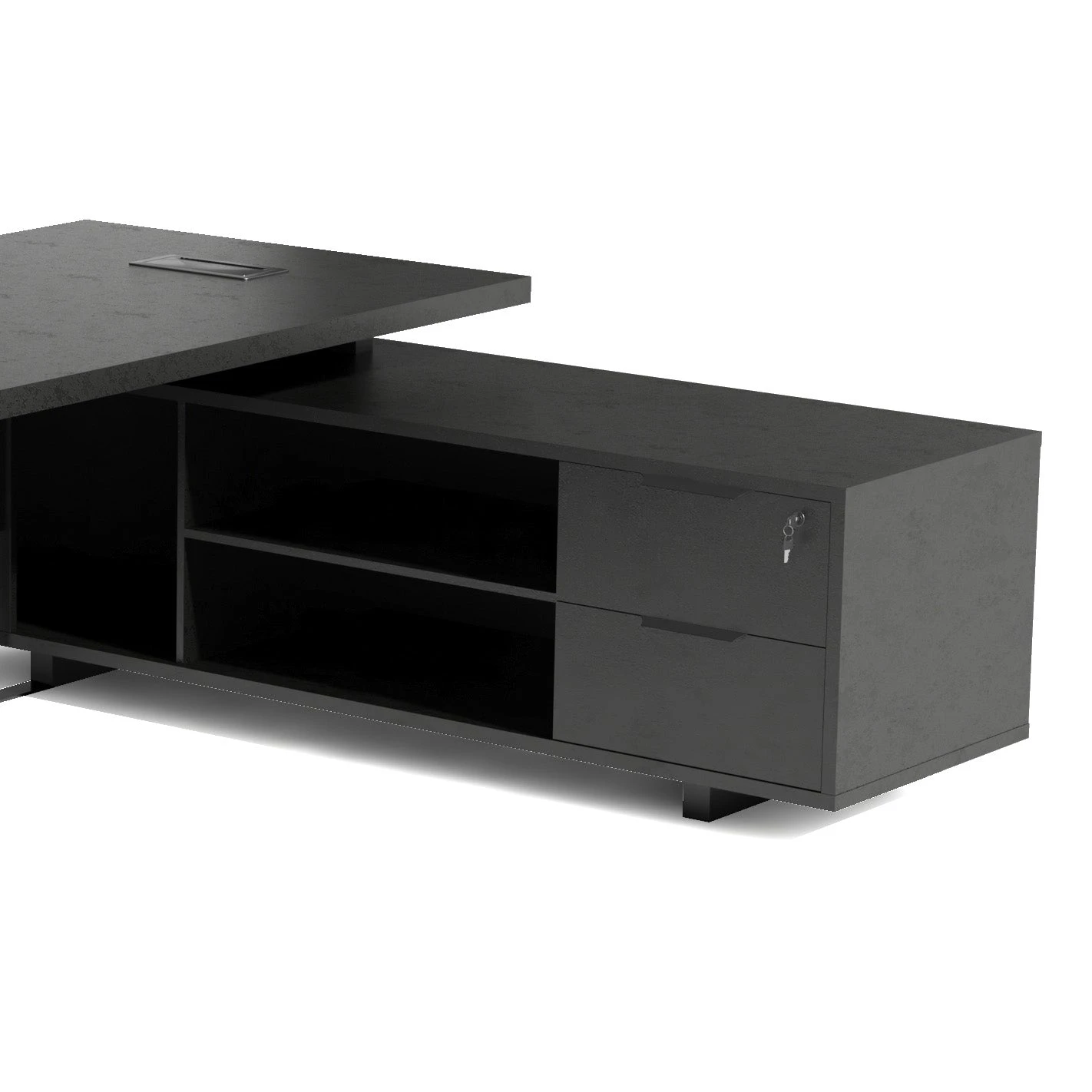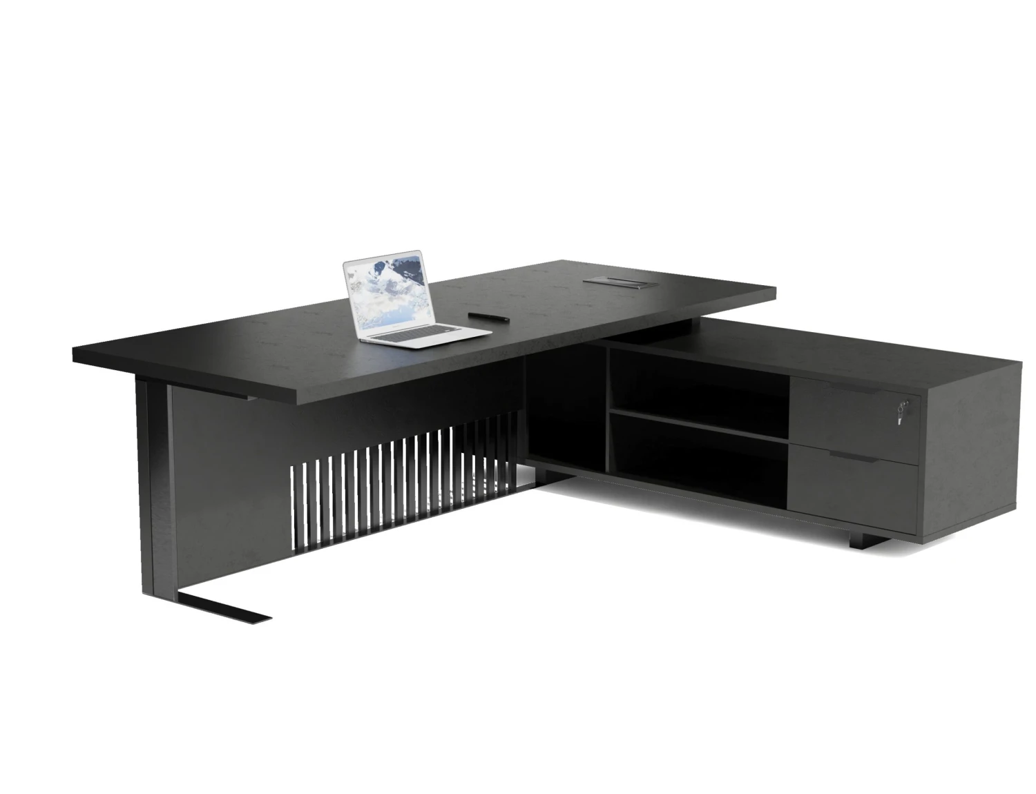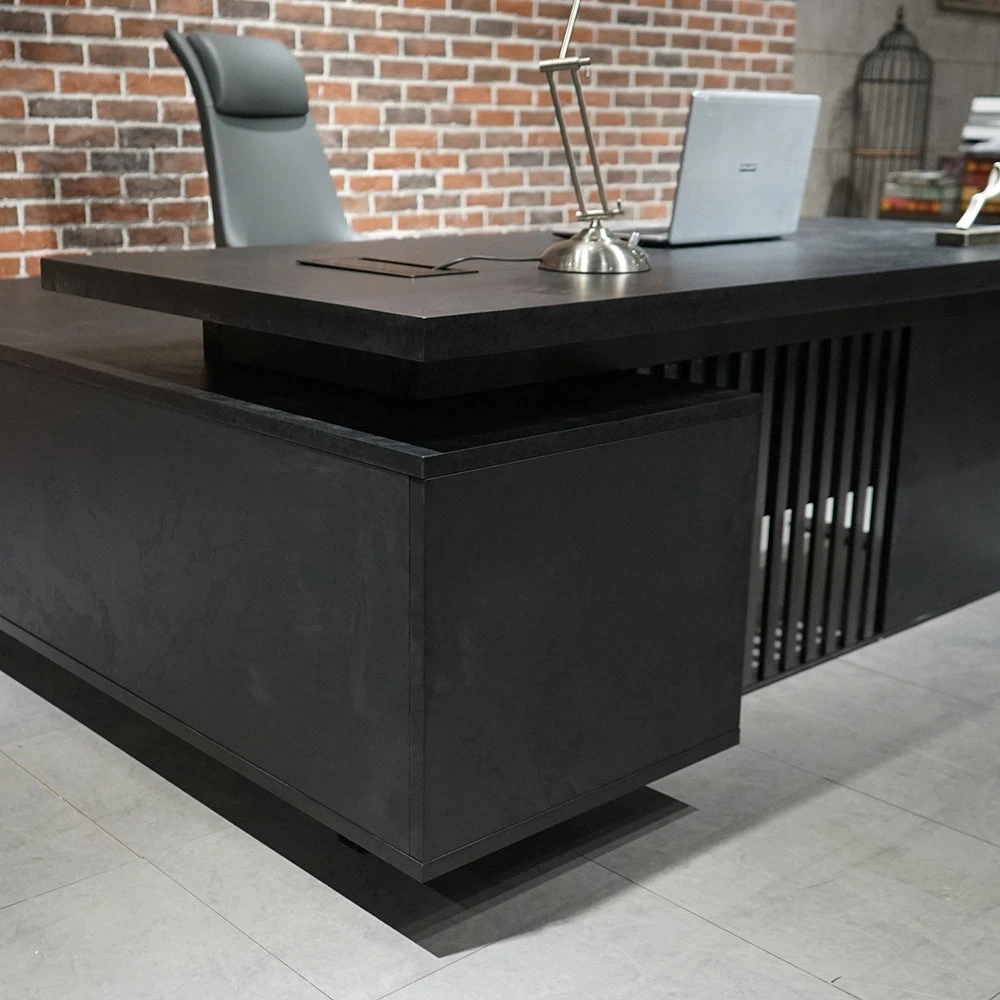 The 2m DAXTON Executive Desk combines sleek black concrete melamine with a premium German Hueck textured surface finish, enhanced by matte black stainless steel bars for a contemporary and sophisticated aesthetic.