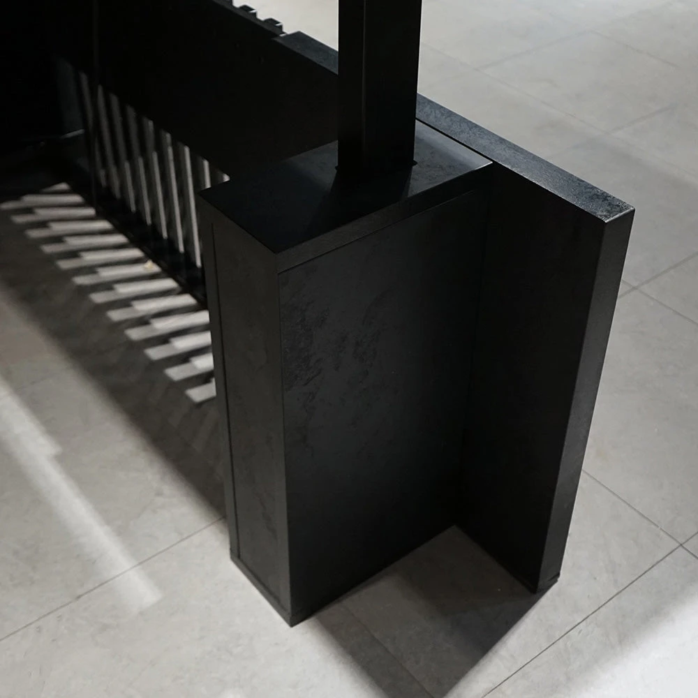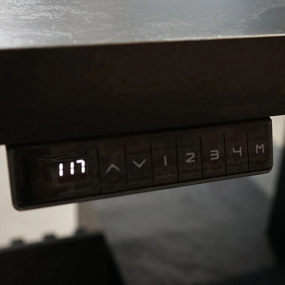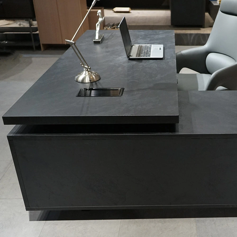 The 2m DAXTON Executive Desk with Lift combines sleek black concrete melamine with a premium German Hueck textured surface finish, enhanced by matte black stainless steel bars for a contemporary and sophisticated aesthetic.