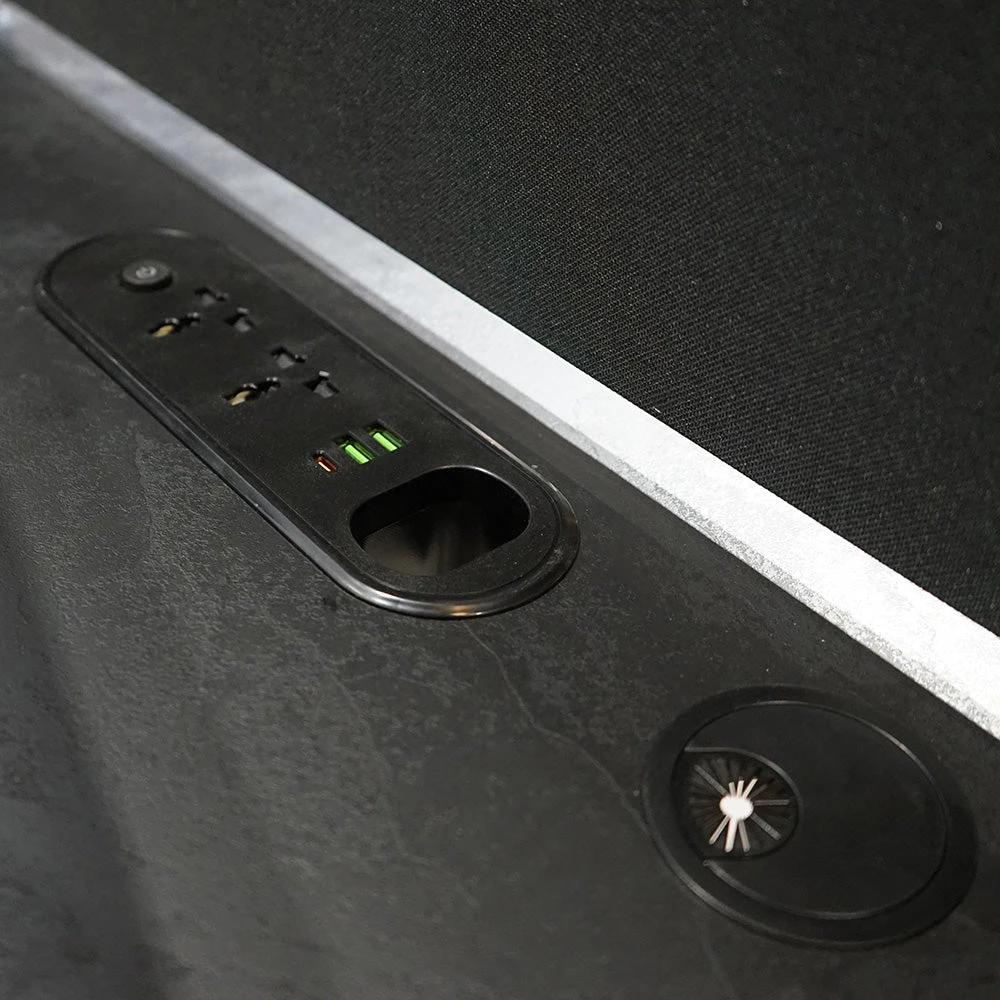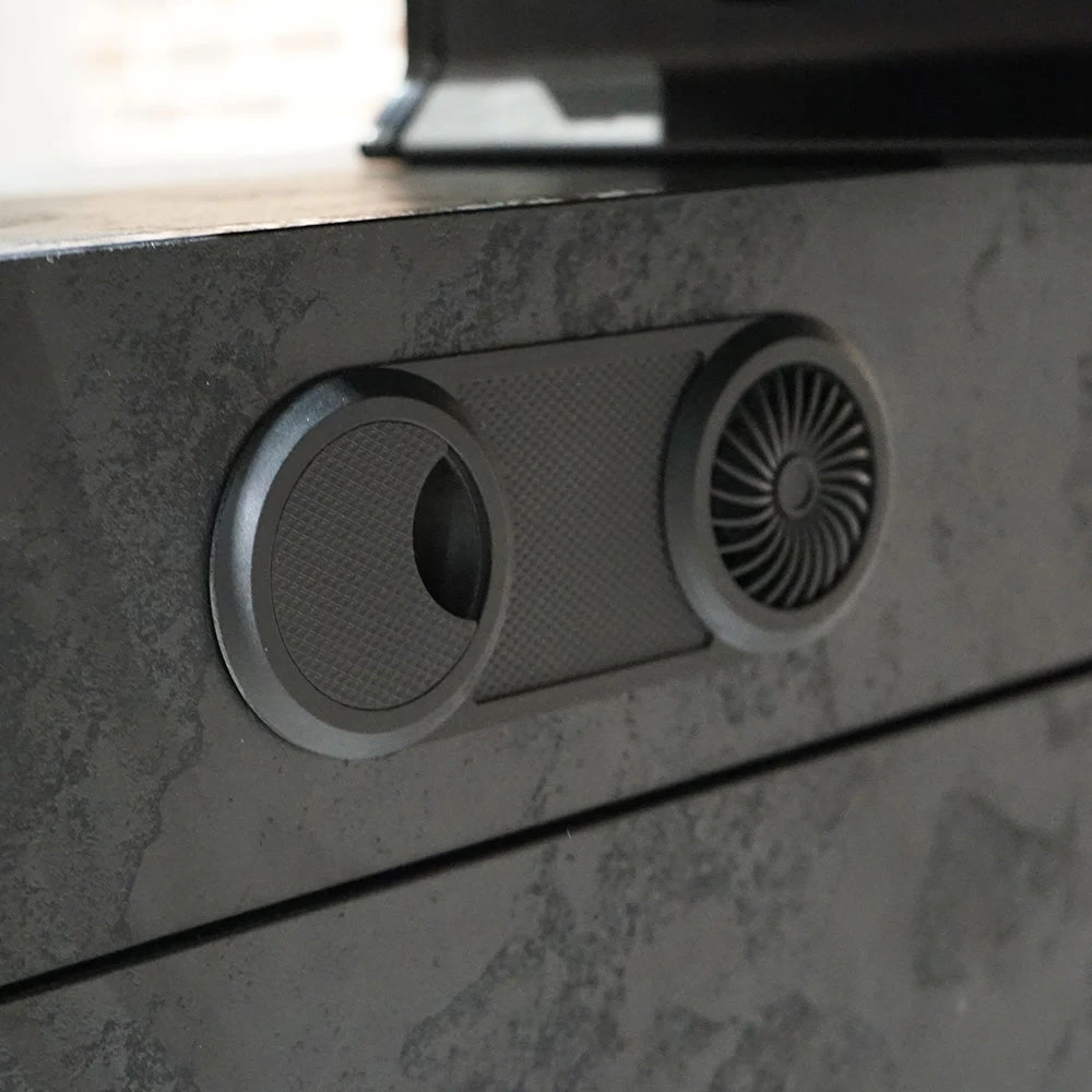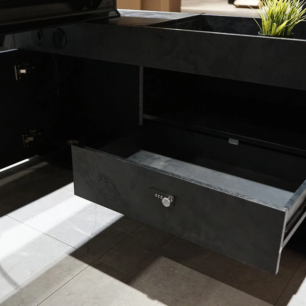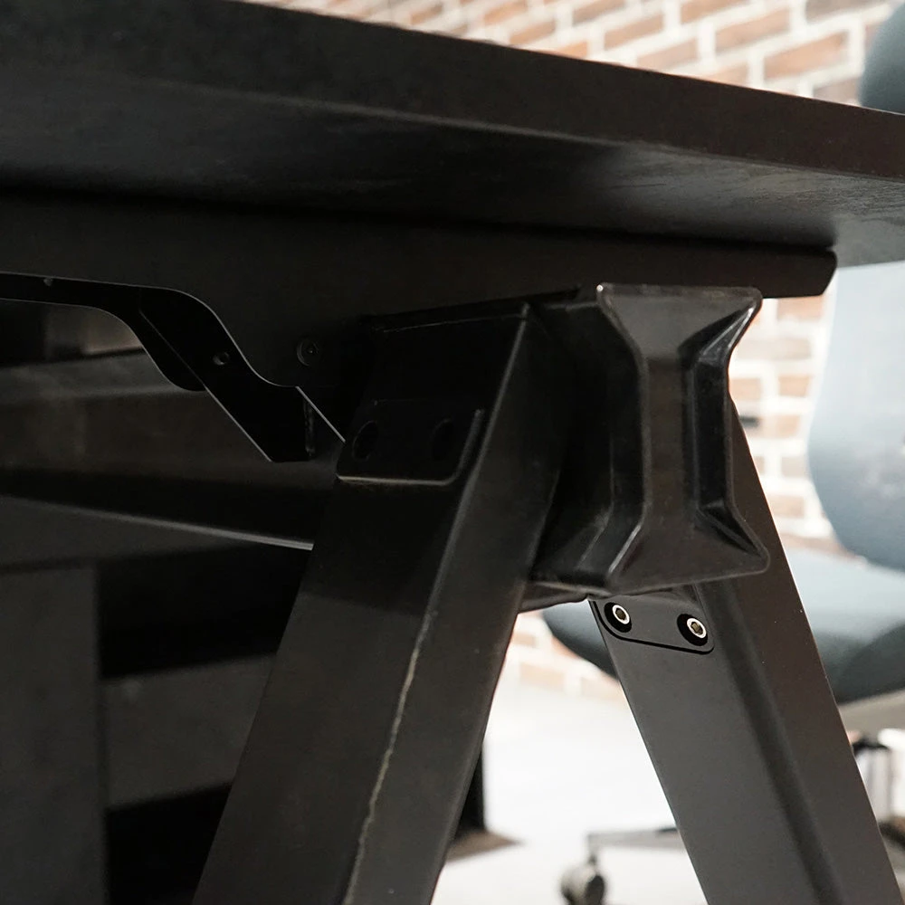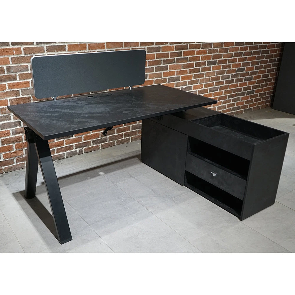 Crafted with an exclusive matte-black concrete finish, the German Hueck textured commercial-grade melamine offers a refined and modern look. Complemented by powder-coated matte black metal legs, this workstation provides exceptional durability and a sleek, cutting-edge aesthetic.