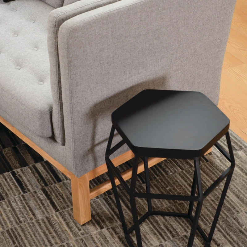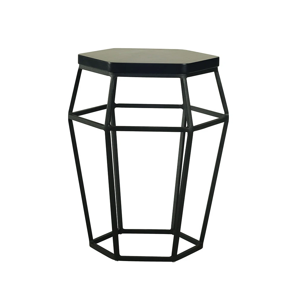 The black metal geometric design of the FORD has a barrel-like shape topped with timber in a black lacquered finish. The piece can be used as an occasional stool, occasional table or side table.