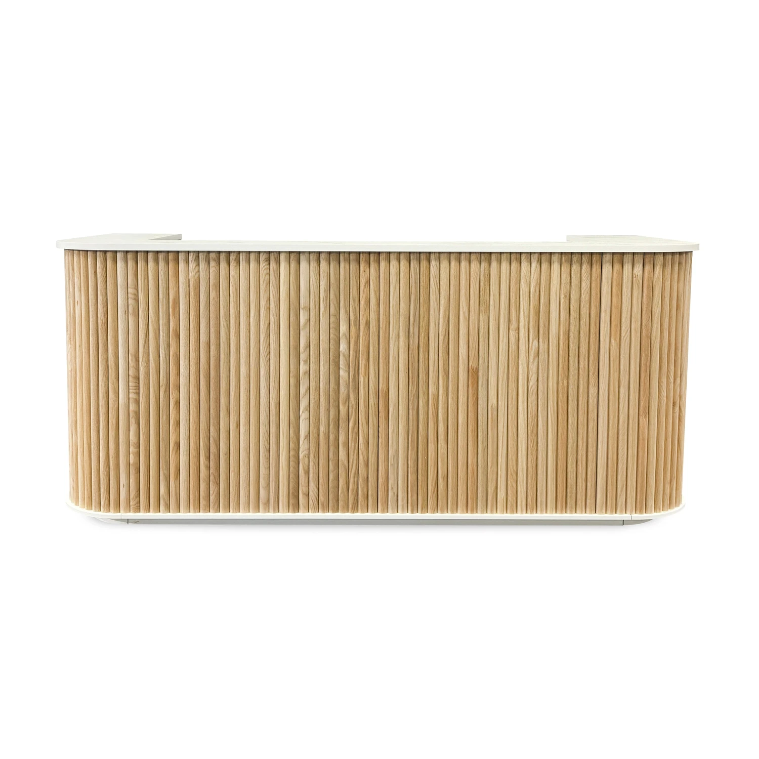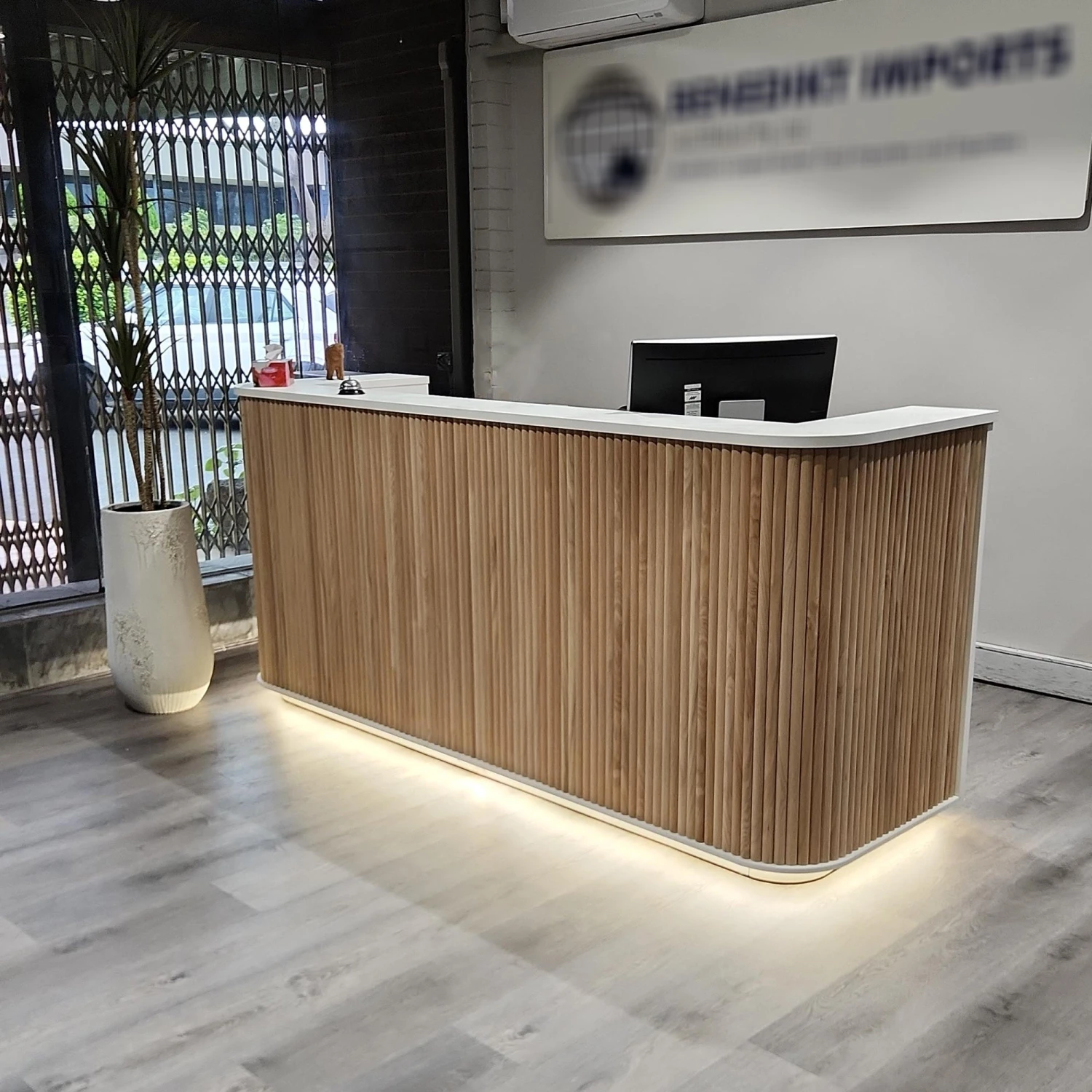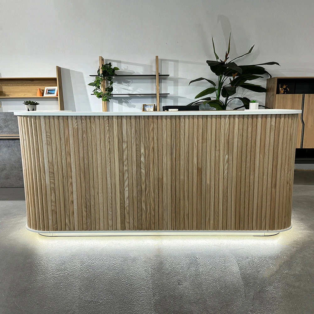 The 2.4m HALO Reception Desk reception has Oak slat feature with white textured German Hueck melamine finish. The panels are evenly spaced and includes LED lights on the Kickboard to add a striking effect.
