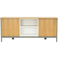 The modern JARVY Sideboard with two spacious cupboards and central shelving. The top and cupboards of this sideboard are in a natural veneer finish. The legs are in grey metal.
