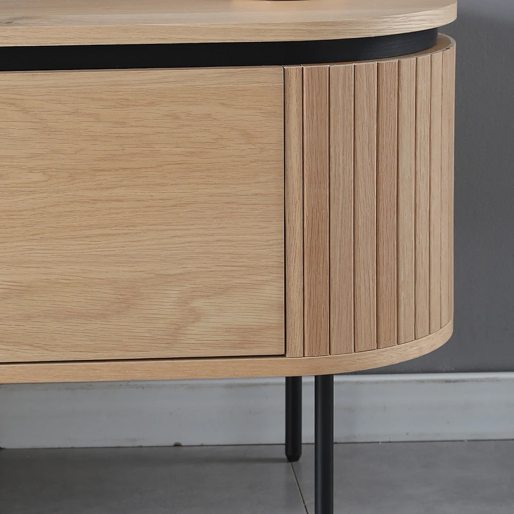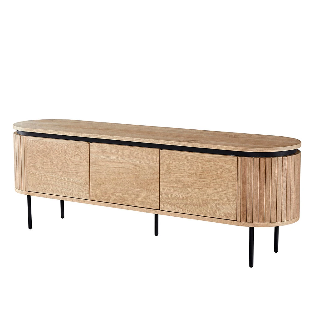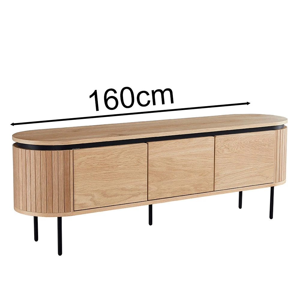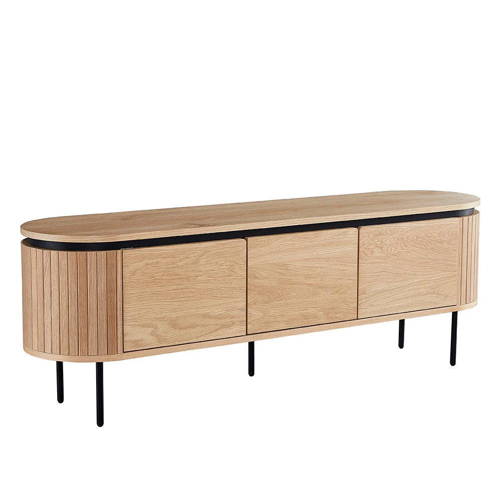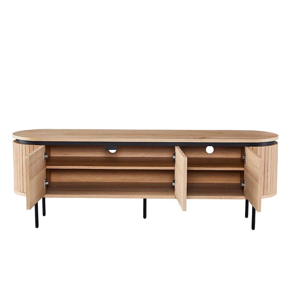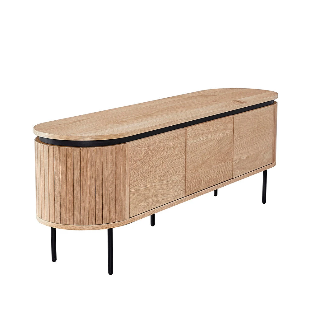The KAIDAN Entertainment TV Unit is a fantastic addition to modern homes. The blend of veneer doors with rounded edges and a slat finish creates an elegant appearance. The metal legs, along with delicate black trim, add a touch of sophistication to the design. With doors offering easy access and ample storage, this unit strikes a perfect balance between functionality and style. Seamlessly combining form and function, it enhances the overall aesthetics of your living space while providing practical storage solutions.