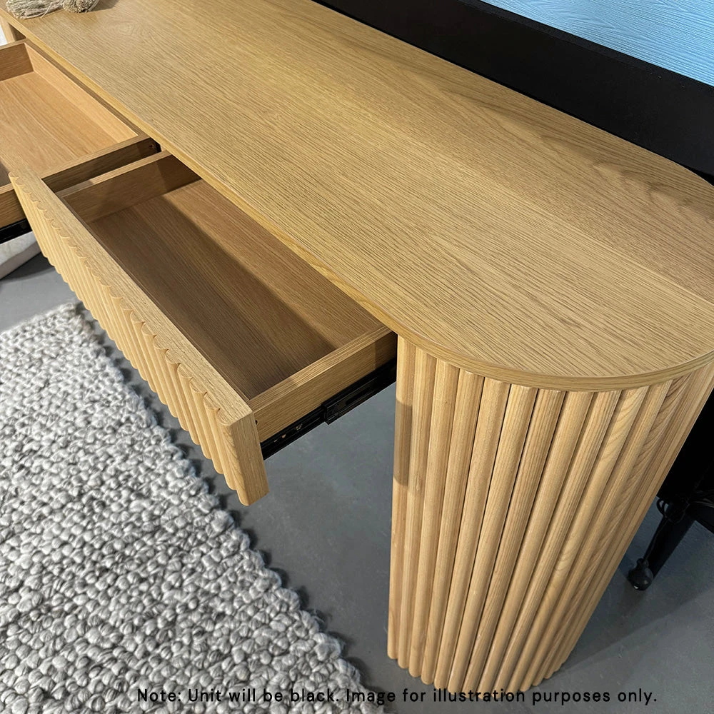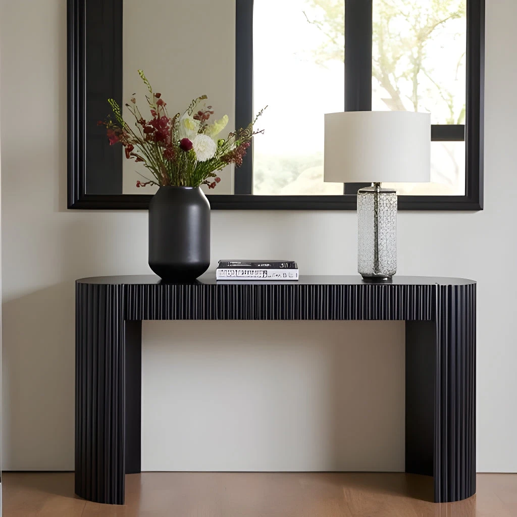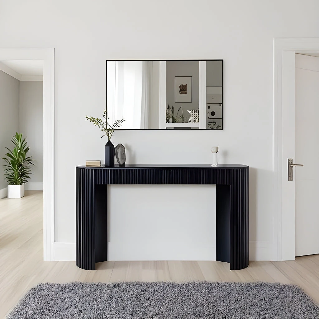 The KELYN Console Table features rounded edges and two storage drawers, showcasing a minimalist design that exudes elegance and modernity. Its seamless, timeless aesthetic makes it a must-have addition to your home decor. This console table combines functionality with style, adding a touch of sophistication to any space while providing a practical surface for versatile use.