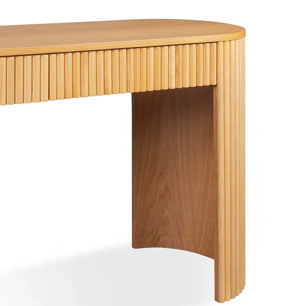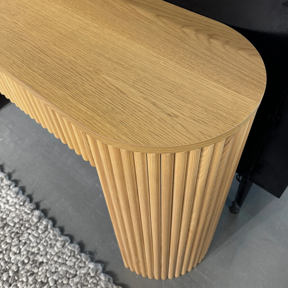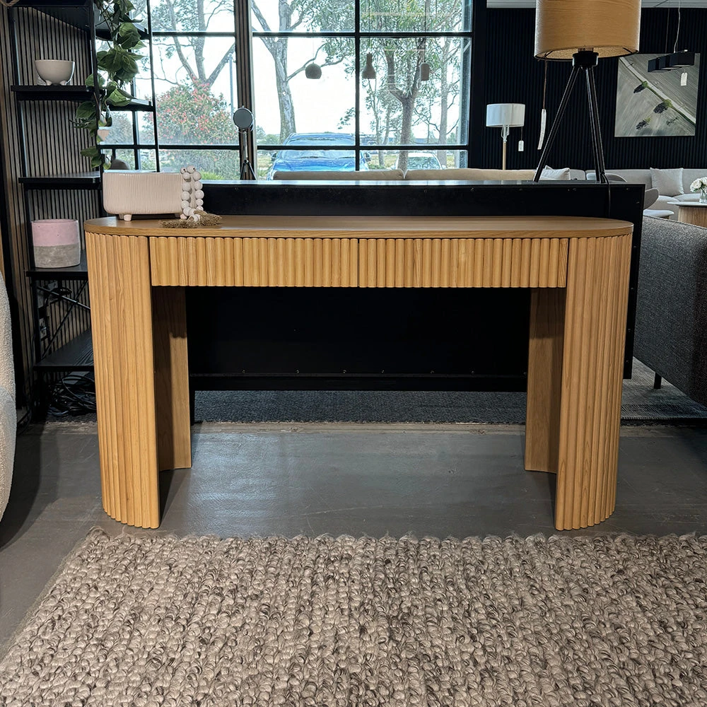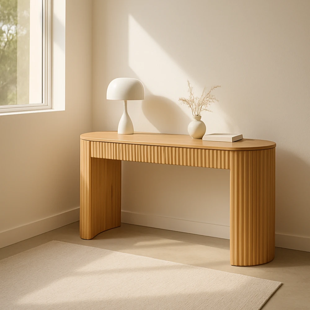 The KELYN Console Table features rounded edges and two storage drawers, showcasing a minimalist design that exudes elegance and modernity. Its seamless, timeless aesthetic makes it a must-have addition to your home decor. This console table combines functionality with style, adding a touch of sophistication to any space while providing a practical surface for versatile use.
