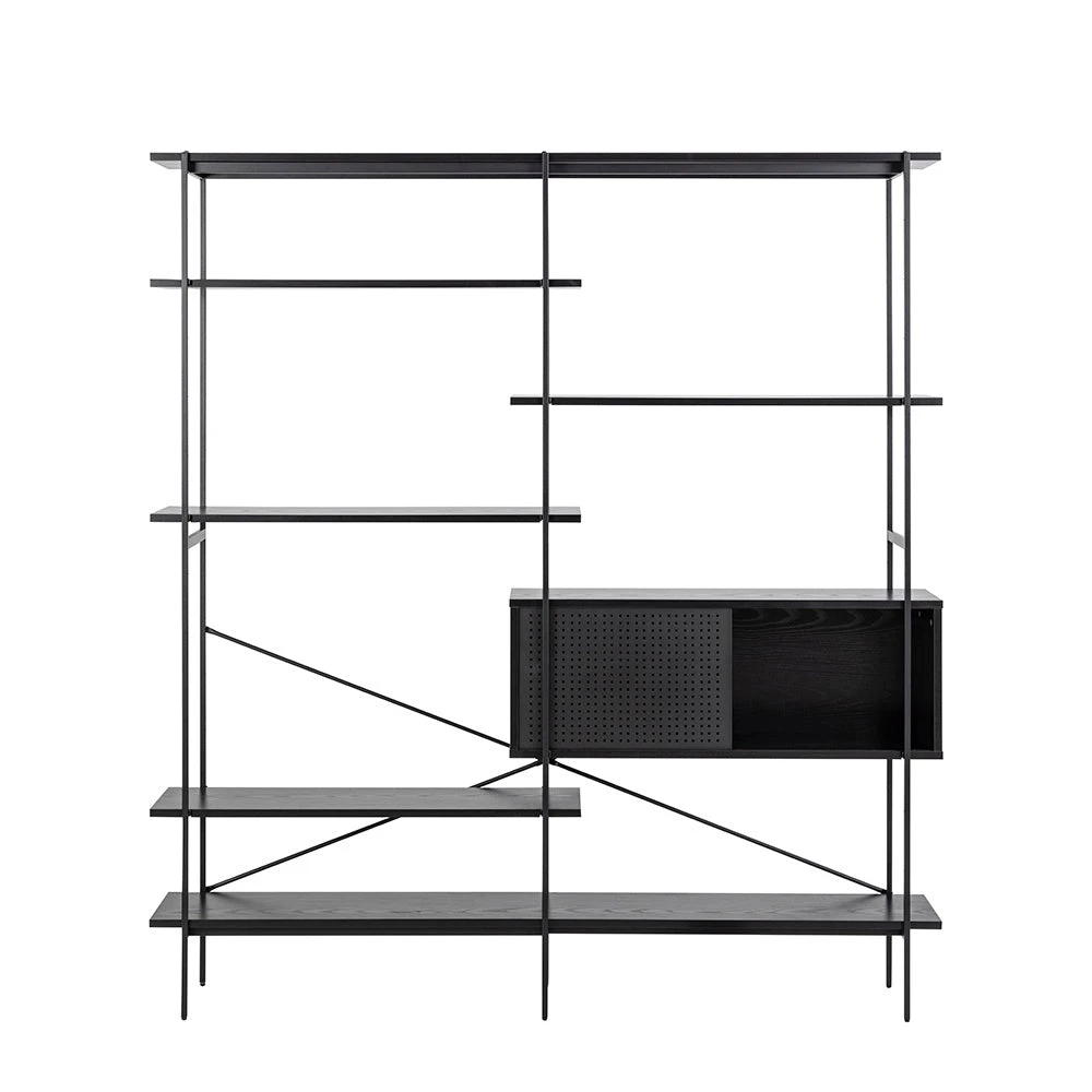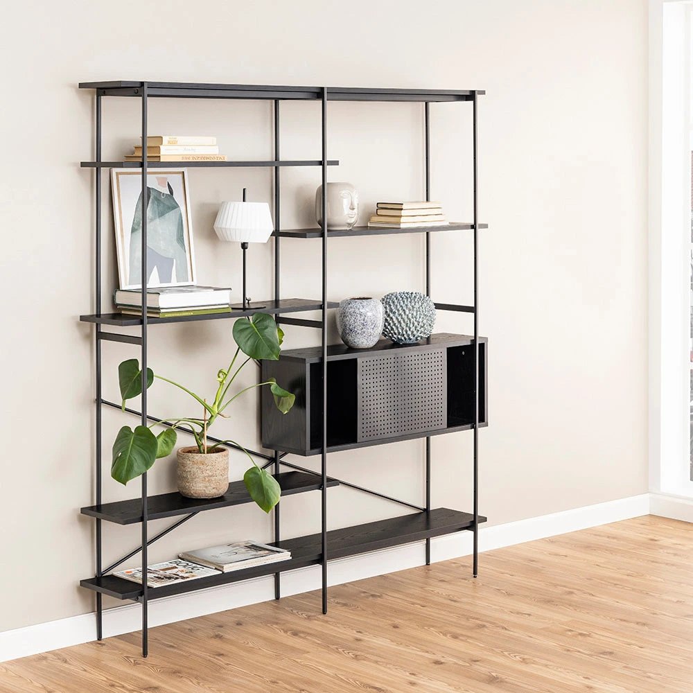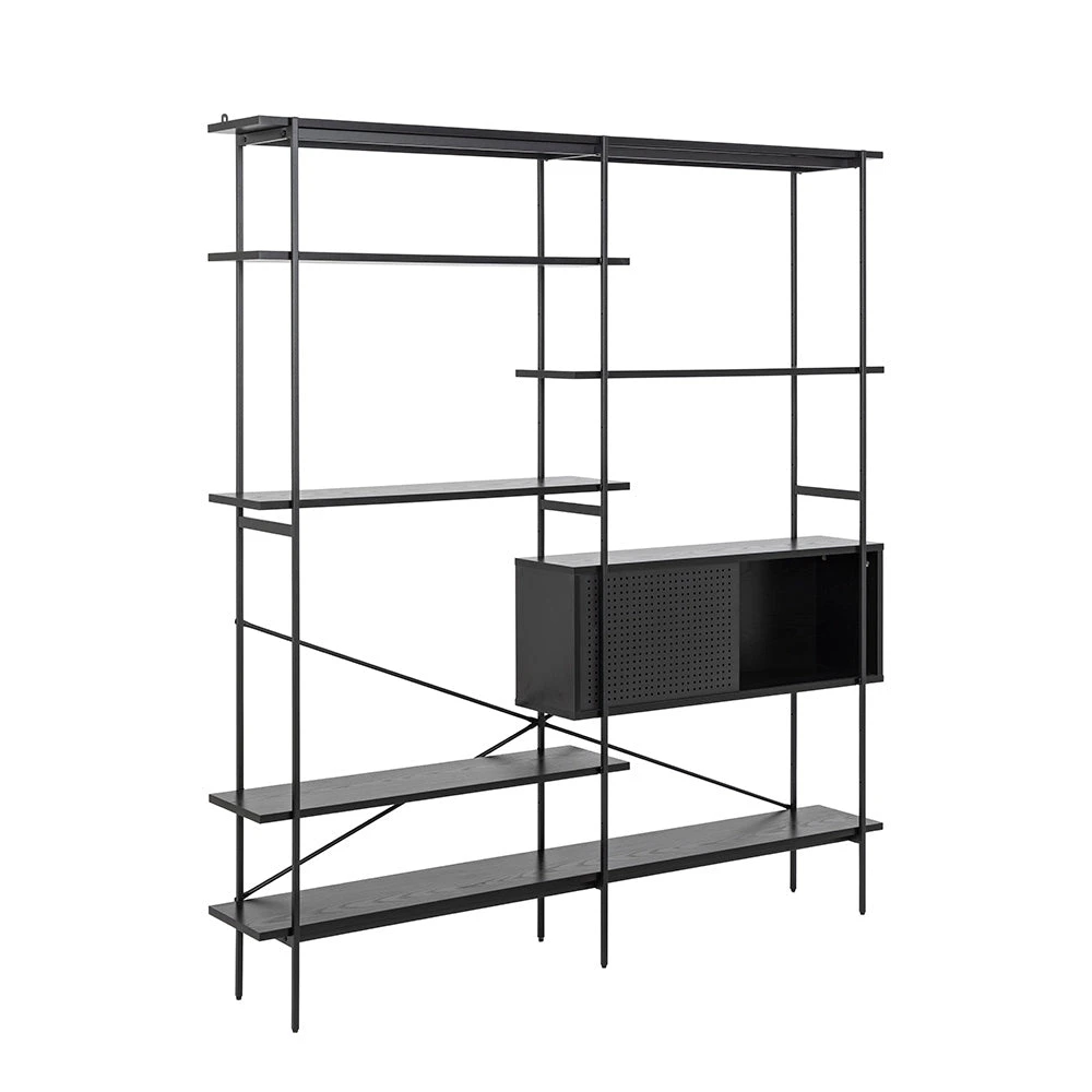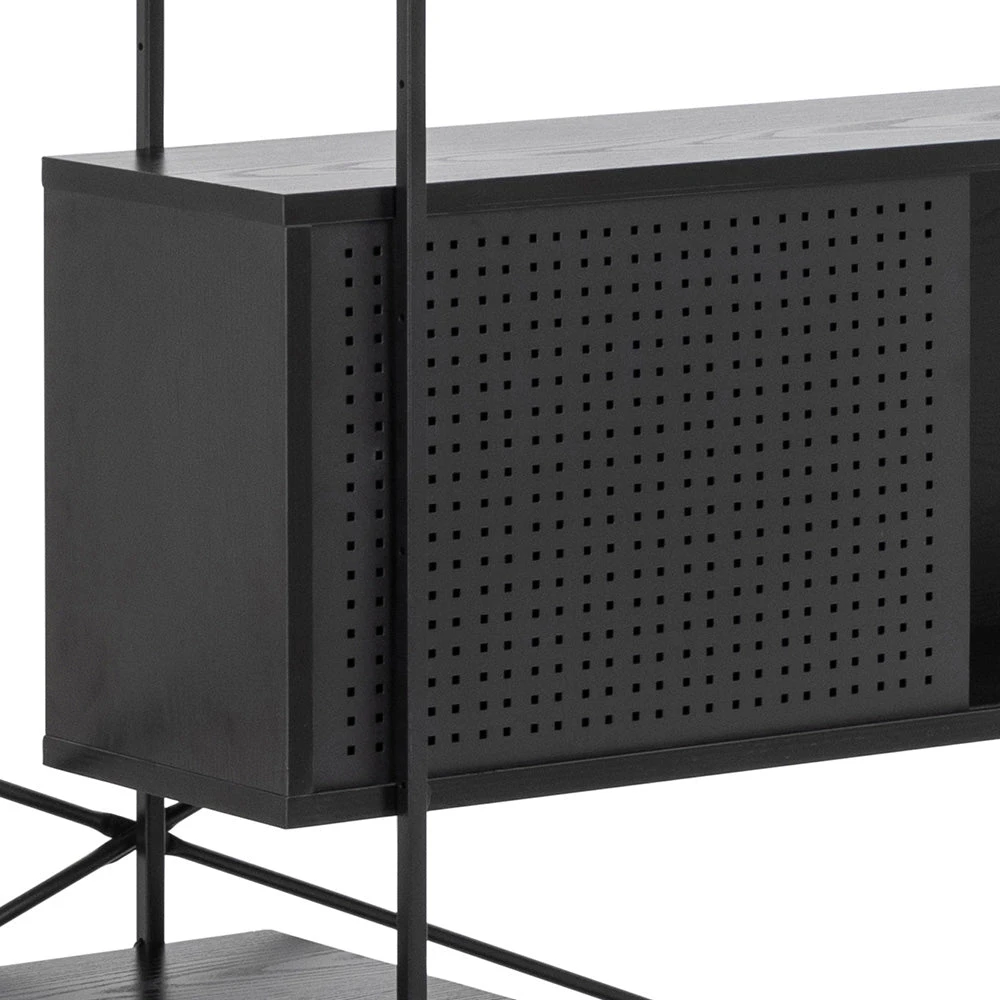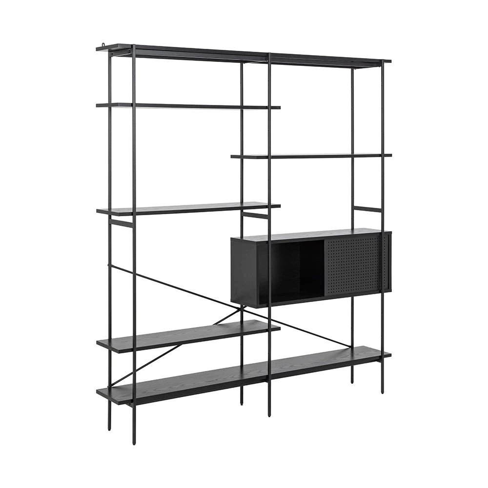 The KREMAN unit with its contemporary and asymmetrical design makes sure all your items get the attention they deserve. The combination of wires, shelves placed in different levels helps to highlight each and every displayed object. To add a contrast and provide a more private storage, it also features a cabinet with sliding doors that visually balances the design.