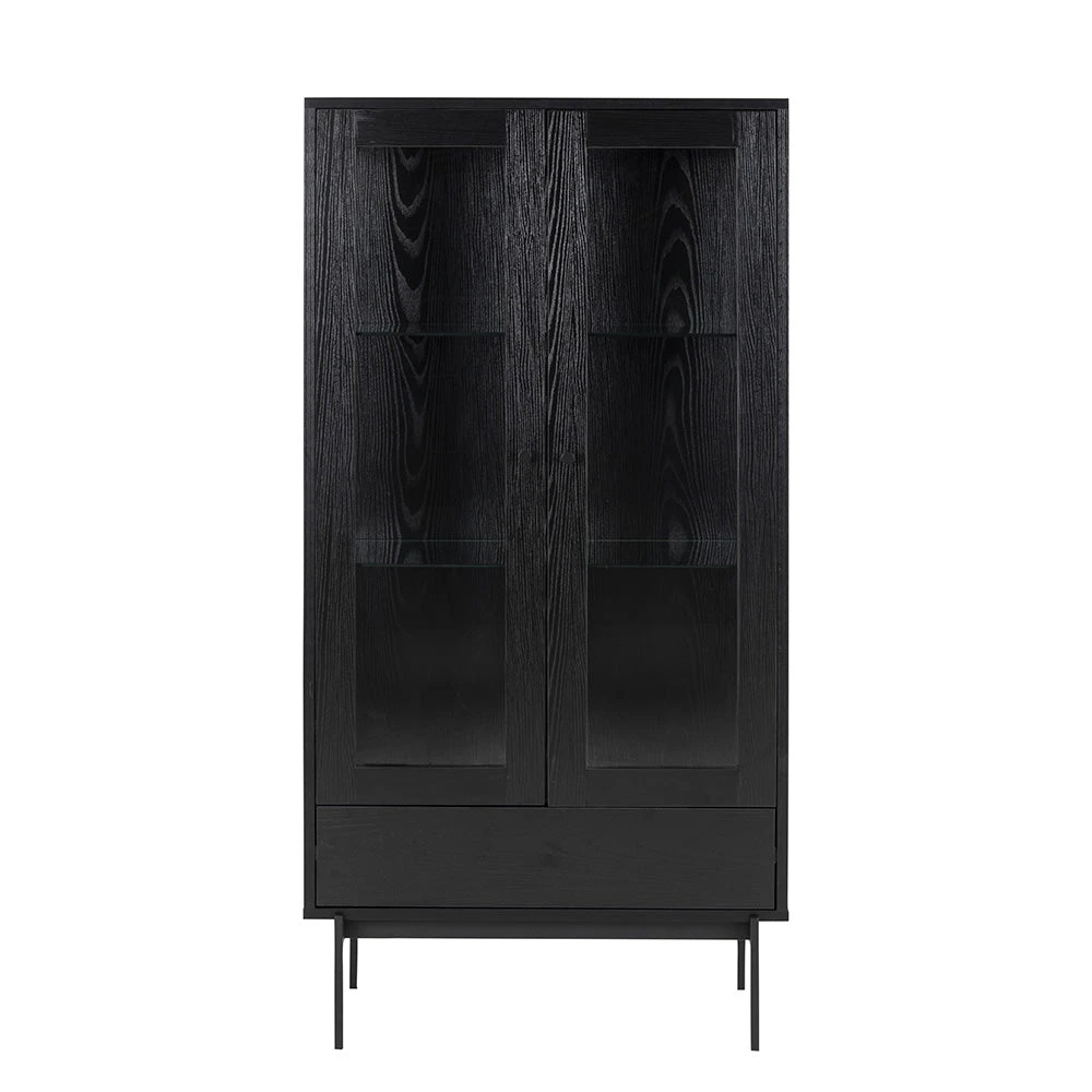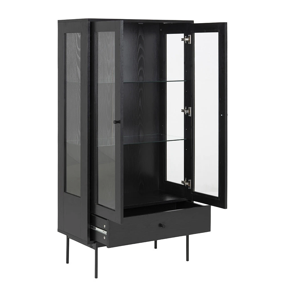 The KREMAN Display Unit featuring an exclusive design, clean lines, and a light structure, boasts a powder-coated metal frame, glass doors, and one drawer. Characterized by its modern aesthetic, this unit is a stylish addition to any home, offering ample storage space. Showcase your favorite items behind the glass doors to add a touch of elegance to your living space. Additionally, the inclusion of glass side panels enhances the visibility of displayed items