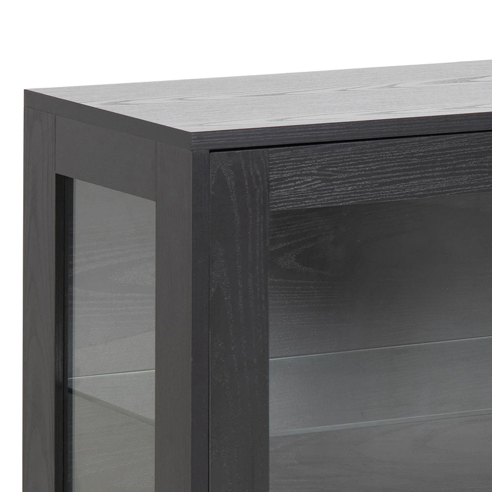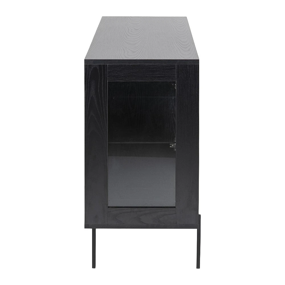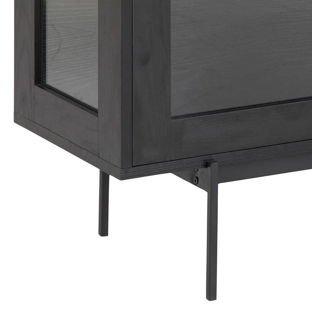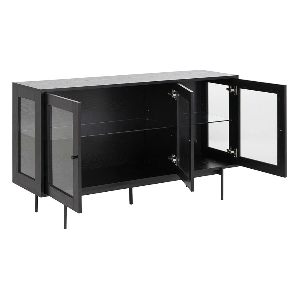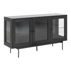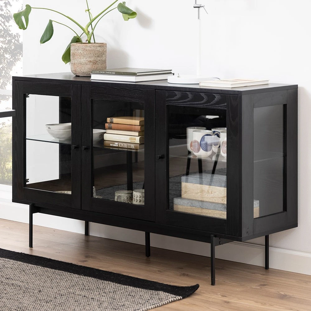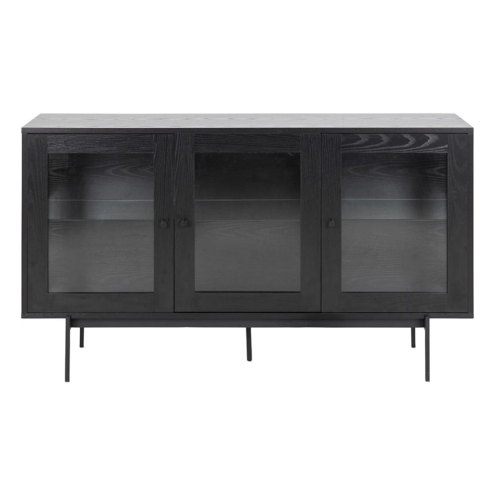 The KREMAN Sideboard featuring clean lines and a light structure, makes a modern addition to any home, offering ample storage space. It includes three glass doors and two shelves made of clear tempered glass, a top surface in ash black rough melamine, and a base in matte black rough powder-coated steel.