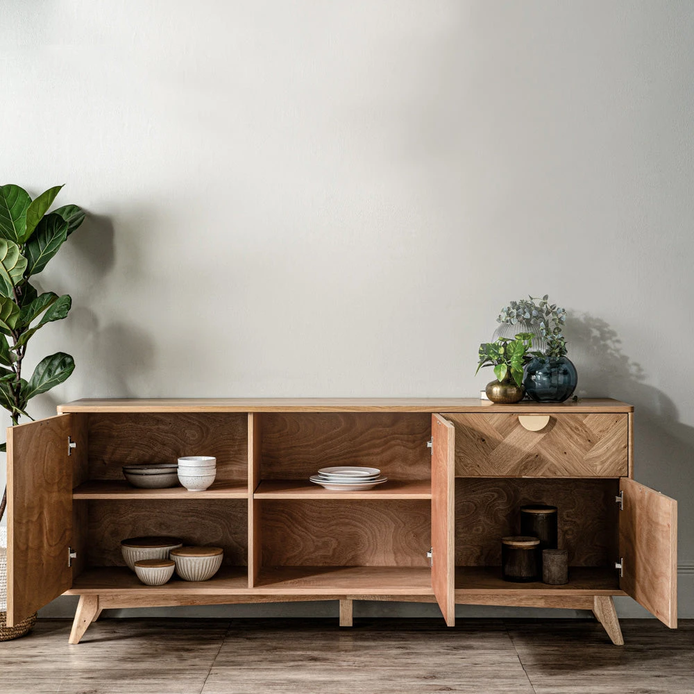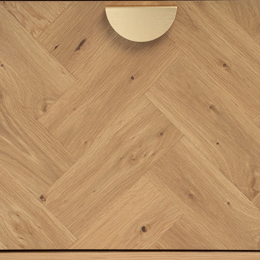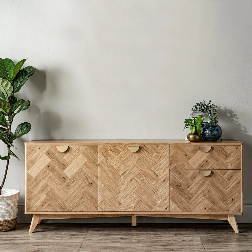 Introducing the LOFTUS Sideboard with herringbone pattern. This elegant piece not only brings a touch of softness to its surroundings, but also boasts round edges framed by Oak veneer and topped with golden handles. Showcasing its grandeur, it packs plenty of storage for your everyday necessities. Make a statement in your home with this Sideboard and be sure to turn heads!