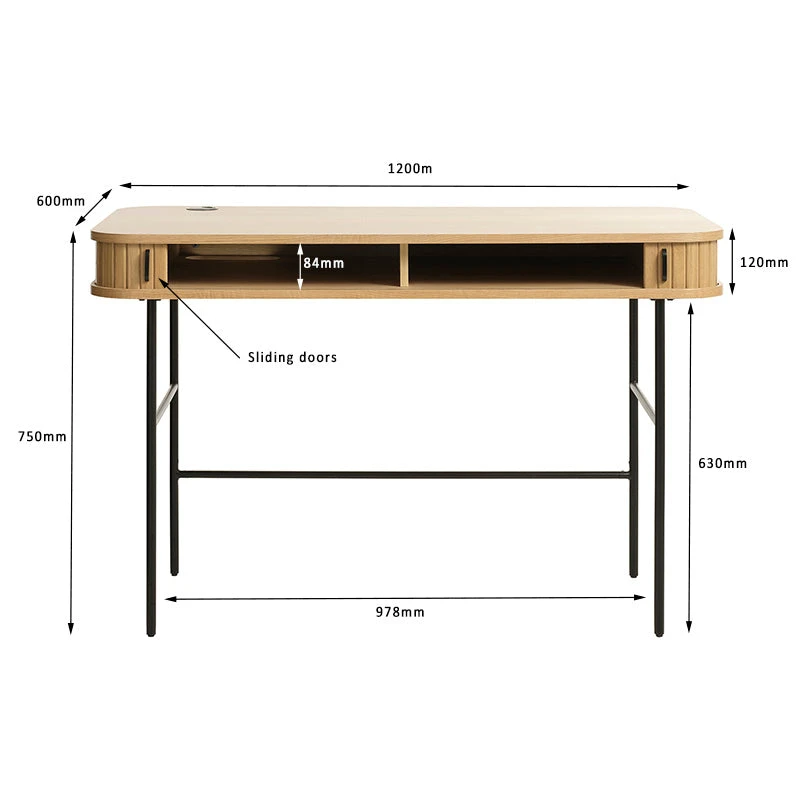 The 120cm desk features rounded edges, has a slat finish design and comes with two drawers/cabinets with sliding doors. The matt black epoxy legs provide a sturdy base, while the metal handles add a touch of elegance. Whether you’re working or studying from home, this desk will help you stay organized.