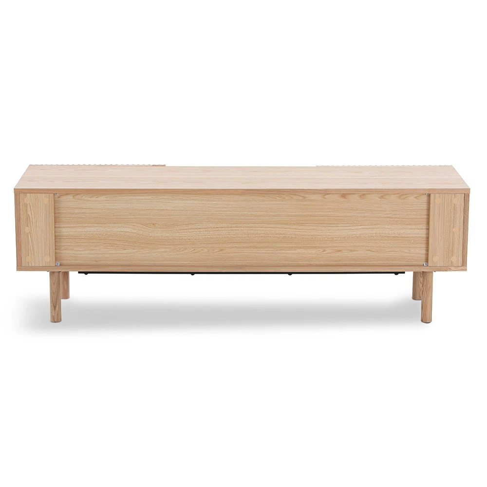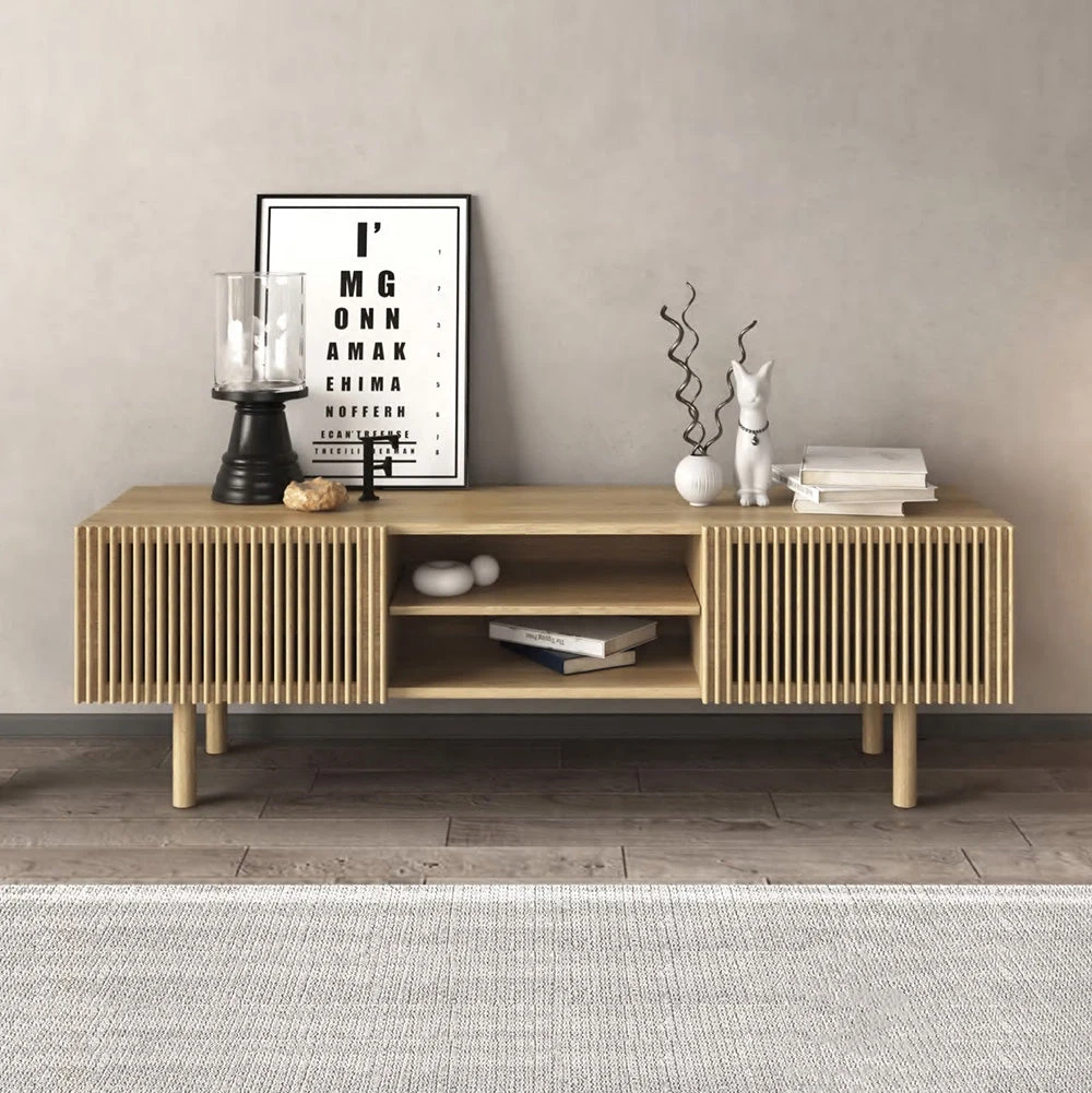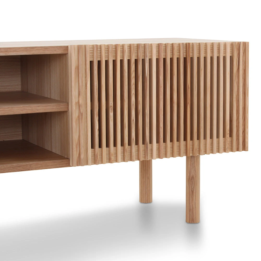 The ORTON Entertainment TV Unit was designed with elegance in mind and a touch of simplicity. The classic design features vertical slats on the door and solid wood legs. The fixed shelf provides ample space and the natural finish gives it a timeless look.