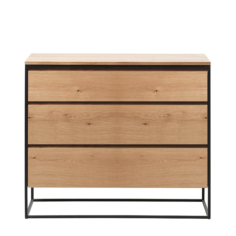 With a square, airy black metal frame as a contrast to NATURAL oak veneers, which are enhanced by a light brushing and built-in handles, the RIVOLI range adds to any study, living or dining room with its minimalistic modern silhouette and industrial look. The sleek RIVOLI Chest of 3 Drawers brings an evergreen touch and functionality to your home.