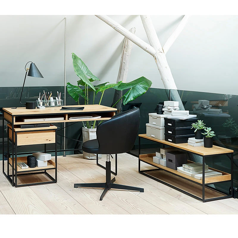 With a square, airy black metal frame as a contrast to NATURAL oak veneers, which are enhanced by a light brushing and built-in handles, the RIVOLI range adds to any study, living or dining room with its minimalistic modern silhouette and industrial look. The sleek RIVOLI Side Table features a shelf to keep your space organized.