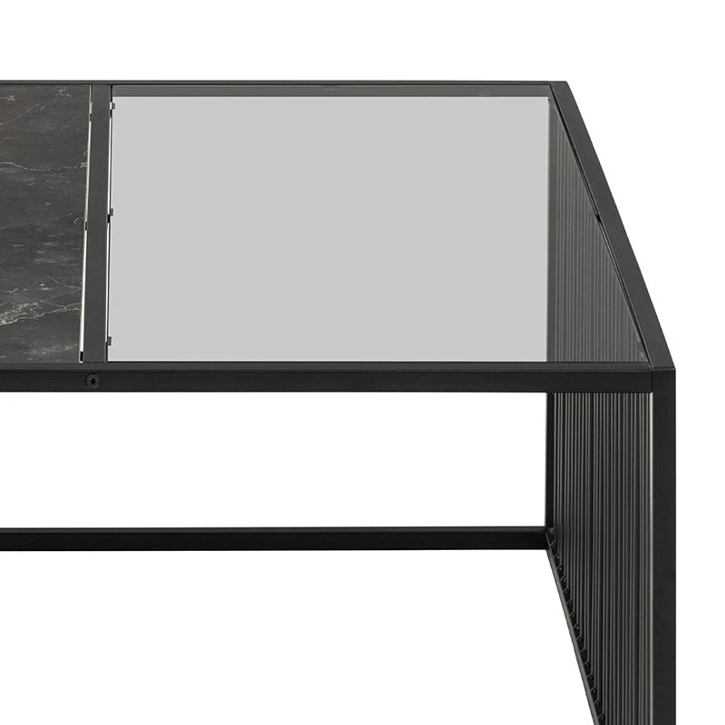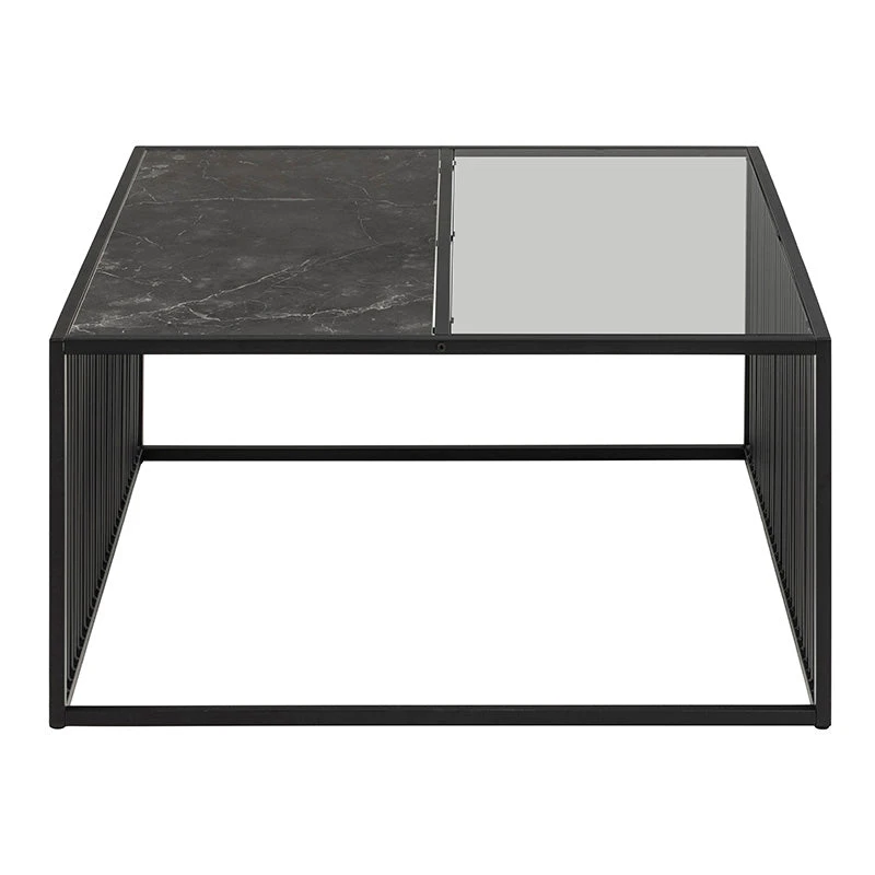 Ready to make a statement? Then prepare for the STRINGTON trendy square coffee table. To achieve that cool vibe, the tabletop is divided with one side of smoked glass and one side of black marble look. The sides complete the look with rounded, vertical metal slats, which also give the design a modern lightness.