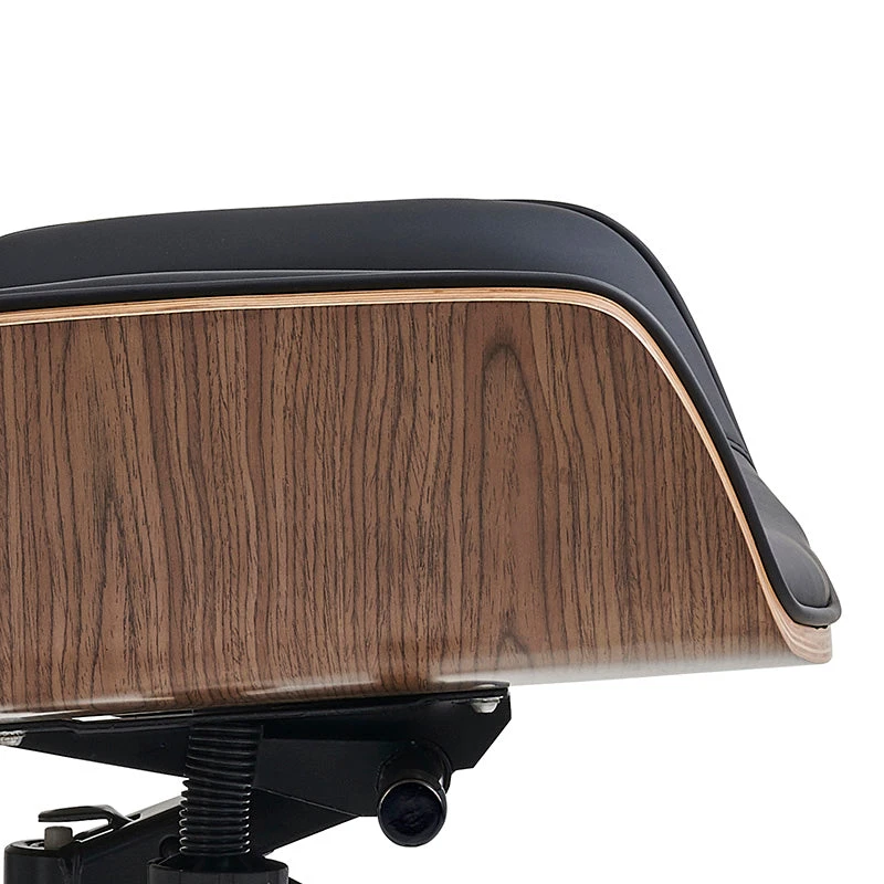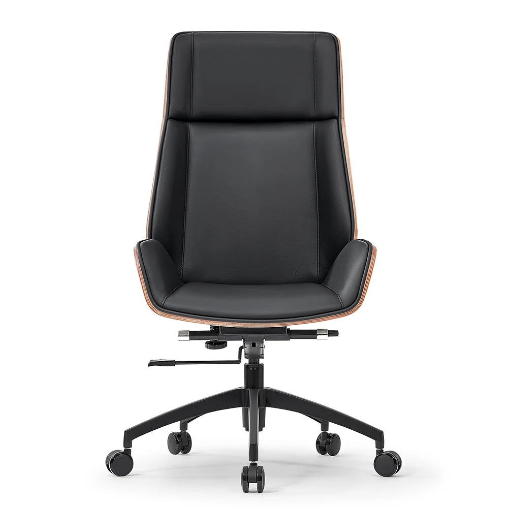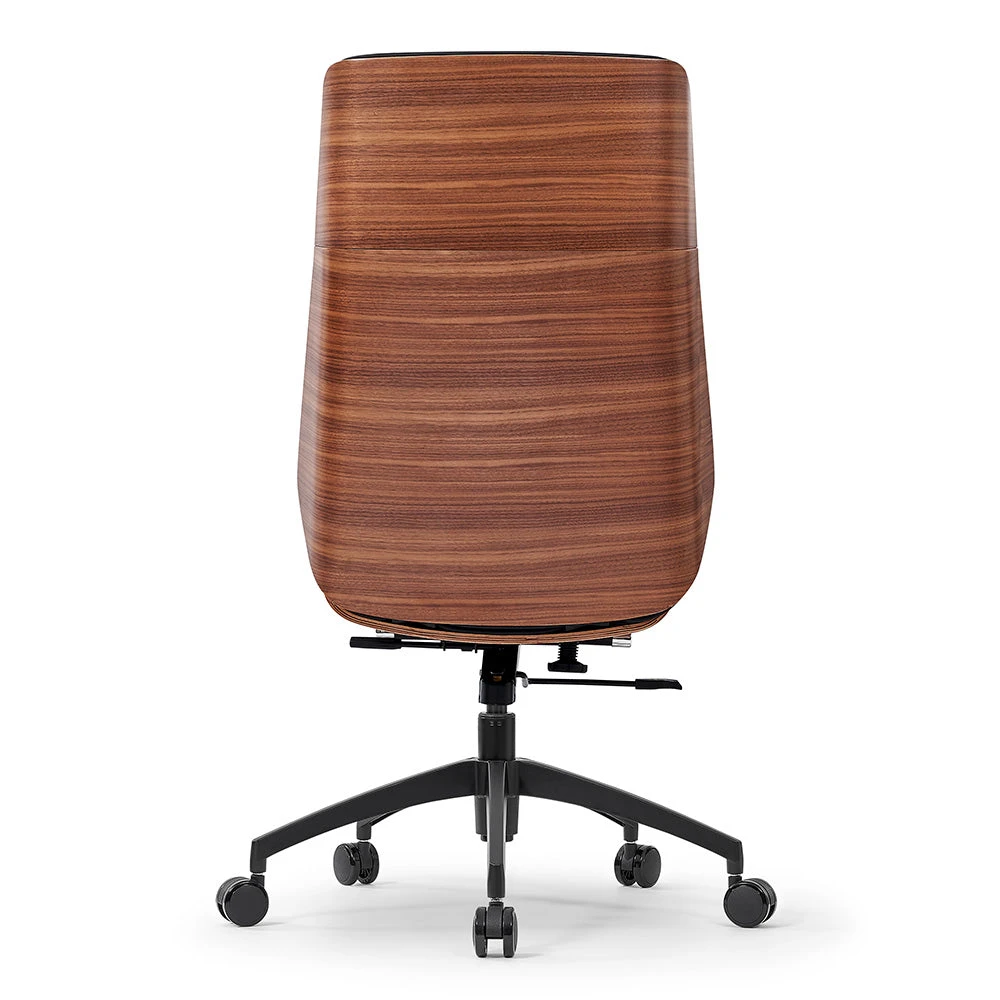 The TYLER high back office chair features a Walnut Bentwood Back and Black PU Leather upholstery, creating a blend of elegance and style. It is equipped with memory foam for enhanced comfort during extended use. The chair’s gas lift mechanism allows easy height adjustment.