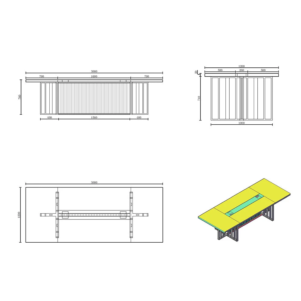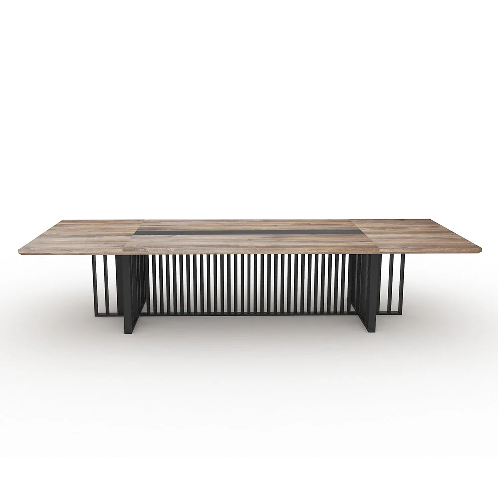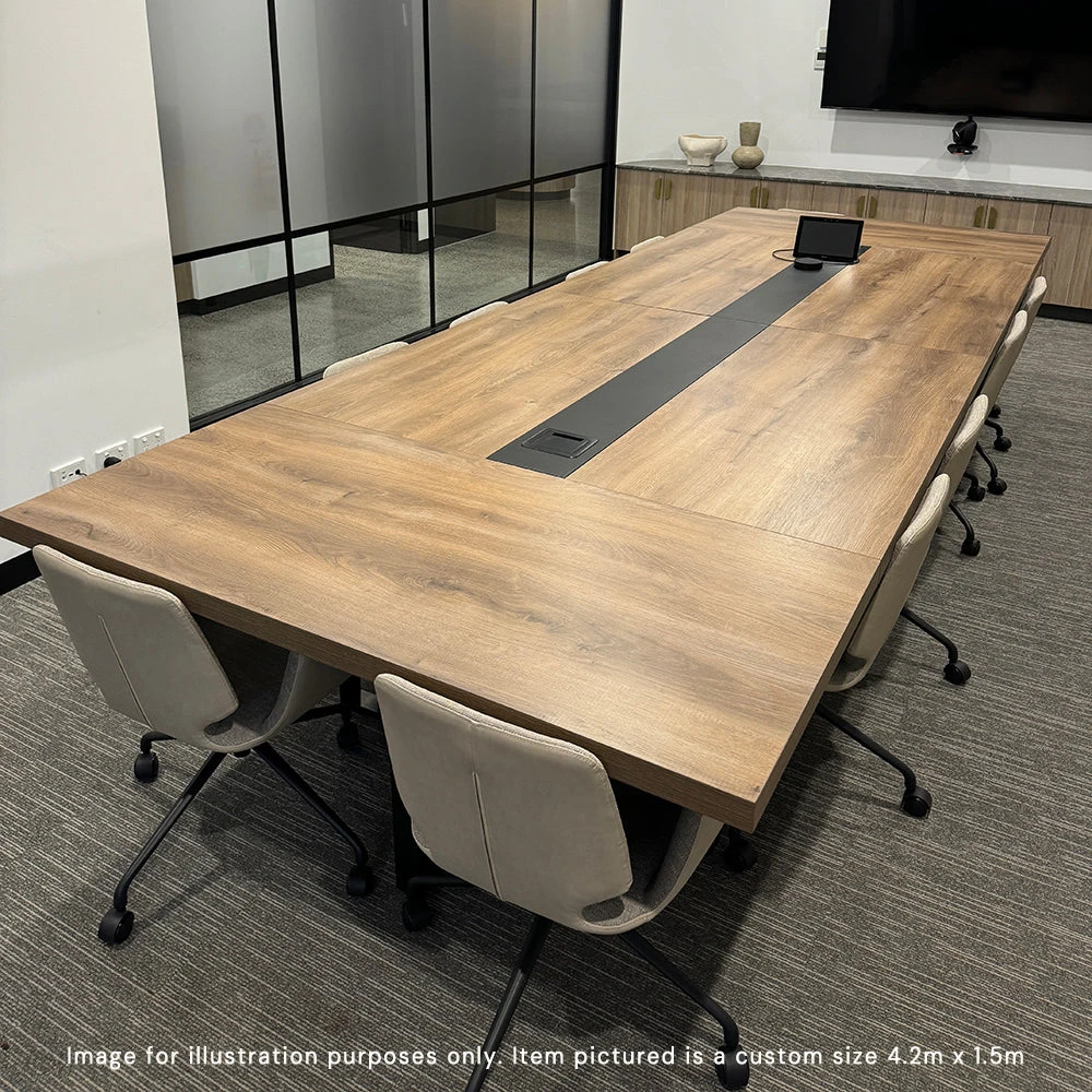 The base, finished with Matt Black stainless steel bars, adds a contemporary touch to the table’s overall design. This boardroom table not only offers a spacious and functional workspace but also contributes to the overall aesthetic of a modern office, making it a focal point that combines style and functionality for important meetings and discussions.