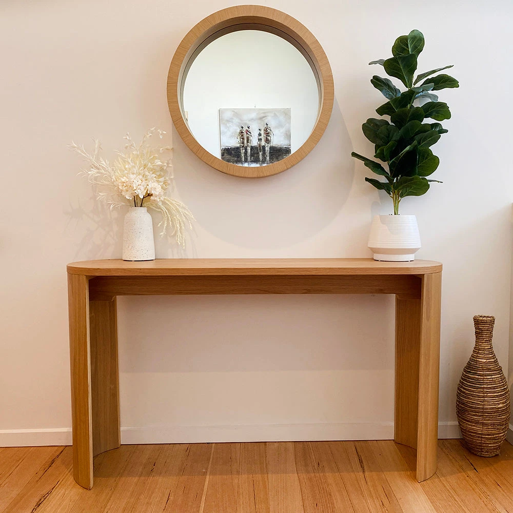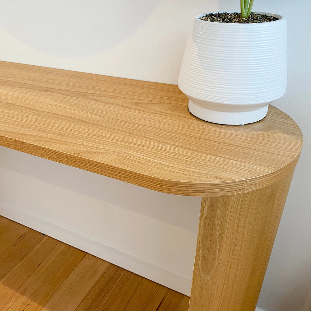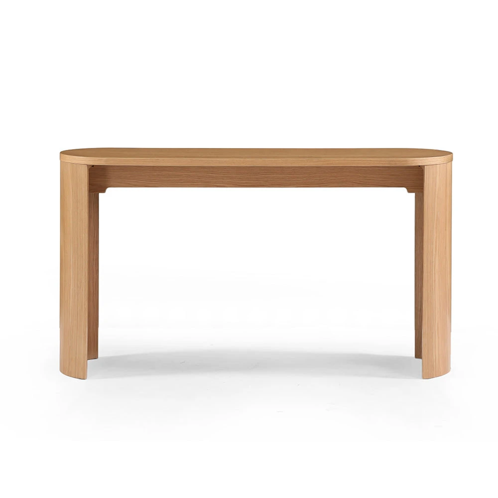 The 140cm ZANA Console Table is slim and elegant, boasting a timeless and minimalist design. Its rounded edges allow it to perfectly blend into any living area, adding a touch of sophistication to any space.. It is crafted from Engineered Wood & Oak Veneer.